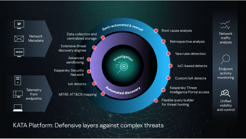 The KATA Platform, combining Kaspersky Anti Targeted Attack with Kaspersky EDR, is an example of this sort of enterprise solution. Its advanced technology layers include: