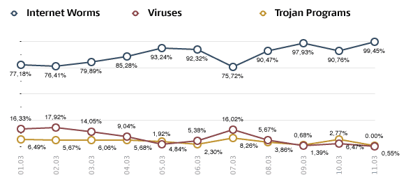 *data from email traffic monitoring Types of malicious programs Throughout the year worms remained the dominant type of malicious programs. Viruses rank second, thanks to the activity of the macro viruses Macro.Word97.Thus and Macro.Word.Saver. However, in the autumn of 2003 Trojan programs overtook viruses, and this trend still continues.