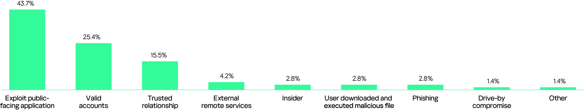 Although the main initial vectors in 2025 remain similar to 2024, their combined share has grown to over 80%. Public-facing applications account for 43.7%, while trusted relationships have increased from 12.7% to 15.5%. Valid accounts make up 25.4%. These insights are from the recent Global Report by Kaspersky Security Services.