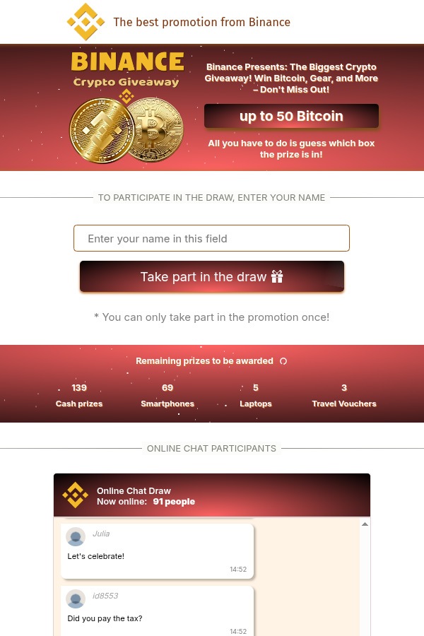 Here’s a survey page containing a scam message and link. The visible portion features a well-known crypto exchange logo and an active link to the attackers’ site. At the bottom, you’ll notice a couple of dots — more on these later