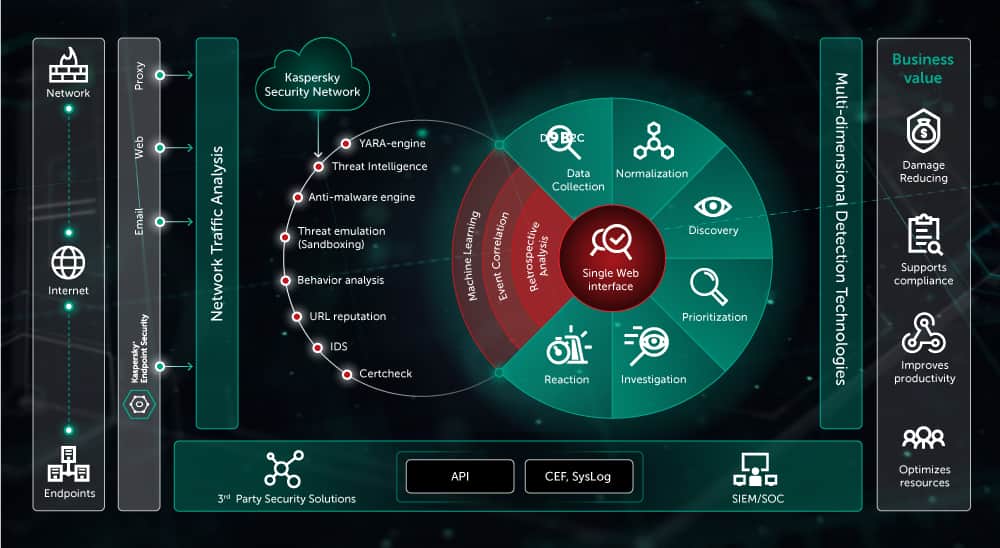 The ML-based correlation engine aggregates network-level telemetry and verdicts and empowers it with endpoint-level data from Kaspersky EDR. It gives complete visibility and correlates incidents with rich context, fully automated and easy to use for better decision making.