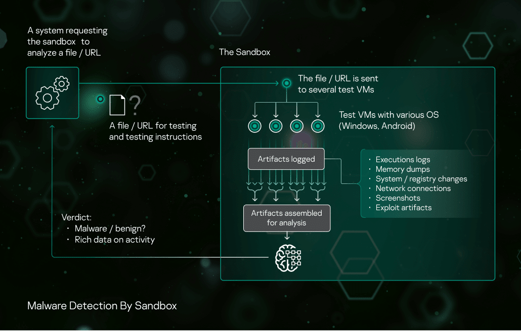 A sandbox is a system for malware detection that runs a suspicious object in a virtual machine (VM) with a fully-featured OS and detects the object’s malicious activity by analyzing its behavior. If the object performs malicious actions in a VM, the sandbox detects it as malware. VMs are isolated from the real business infrastructure.