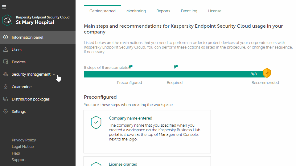 - No additional hardware needed – because the management console is hosted in the cloud, Kaspersky Lab has already taken care of infrastructure for you.