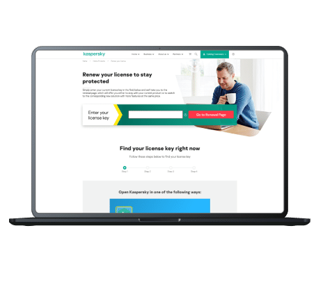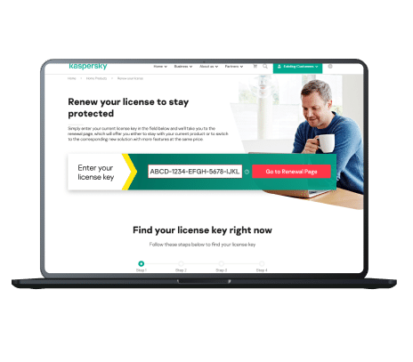 Existing users can get the latest Kaspersky solutions. If your Kaspersky license period is coming to an end you may be eligible to switch to one of our new security solutions. Follow the steps below and enjoy that feeling of complete safety.